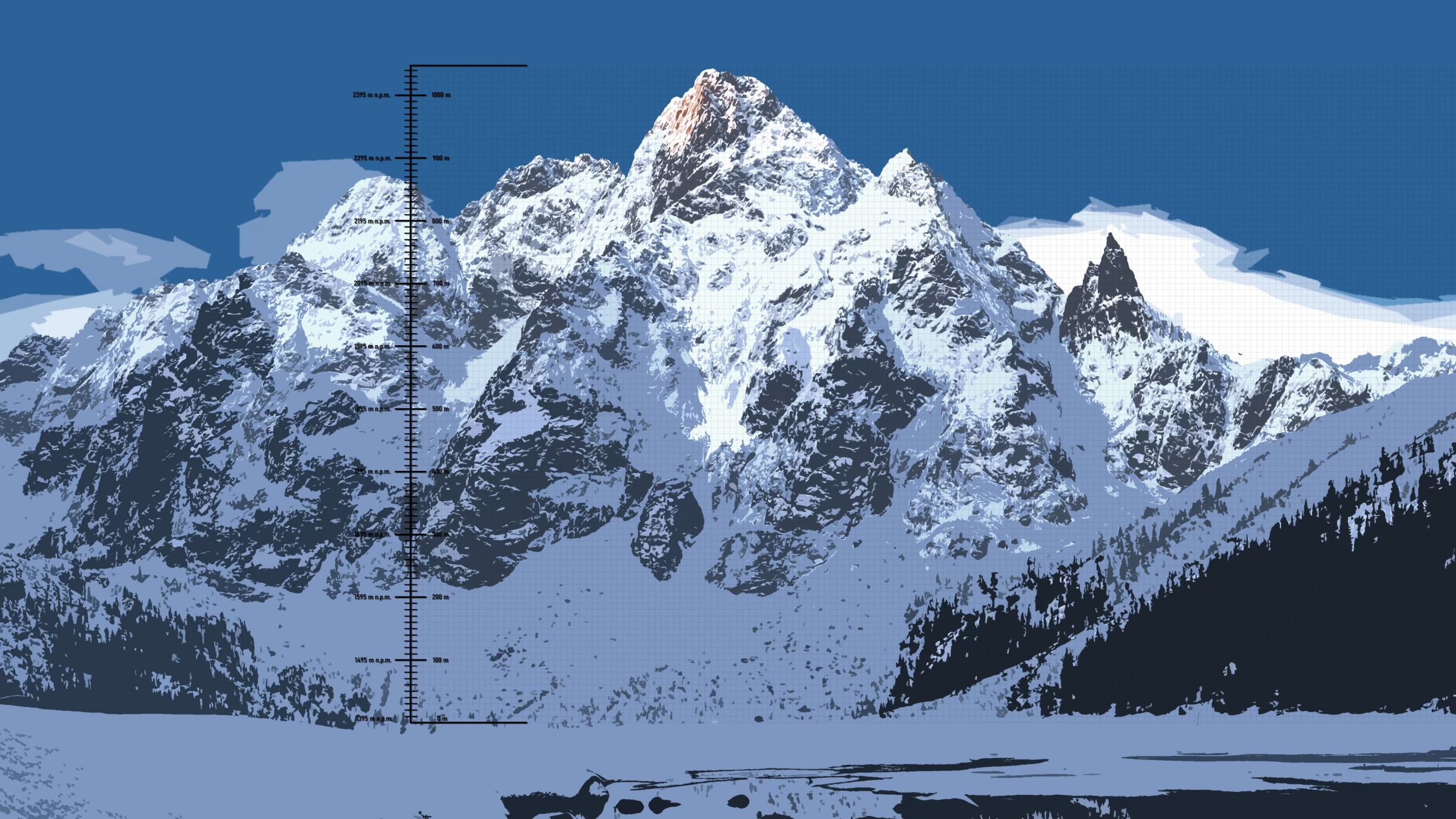 Jest 7 kwiecień 1936 roku, dwóch śmiałków decyduje się spróbować swoich sił na północnej ścianie MSW mierzącej licząc od tafli Morskiego Oka 1044 metry wysokości względnej. Te dwa punkty wielkości 5 pikseli u podstawy ściany są odpowiednio wyskalowaną reprezentacją ciała mężczyzn liczących mniej więcej 1,8 wzrostu.
