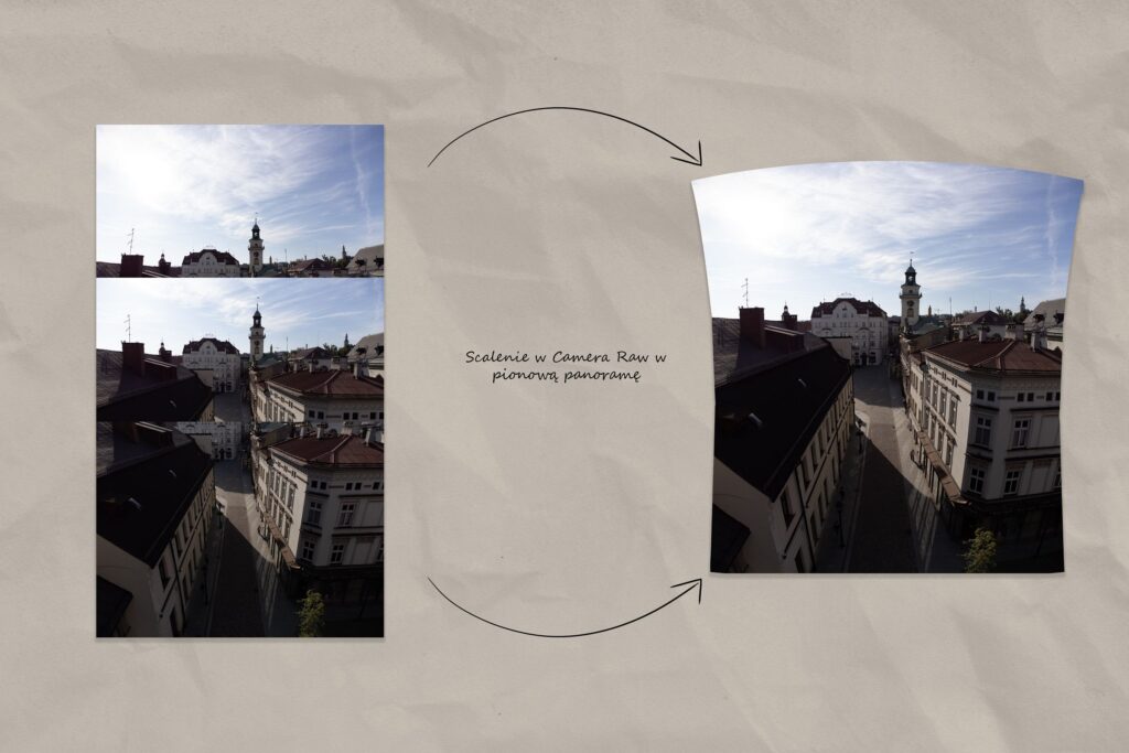 Tak wykonane zdjęcia w formacie RAW, wszystkie trzy naraz wrzucam do Photoshopa który otwiera je wówczas w Camera Raw i scalam je w pionową panoramę. Można wybrać różne opcje odwzorowania, po prostu nie bójcie się eksperymentować i zobaczcie co wygląda według Was najlepiej. Ważne tylko aby odznaczyć automatyczne kadrowanie, wypełnienie krawędzi i automatyczne ustawienia. Jeśli zachowaliście odpowiednie marginesy i nie macie super bliskiego pierwszego planu połączenie zdjęć powinno się udać bez problemu. W ten sposób Camera Raw stworzy nowy plik DNG, który możemy wywołać.
