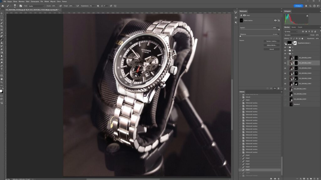 Na końcu całość trafiła do Photoshopa gdzie wszystkie ujęcia zostały wyrównane, stackowane oraz wymaskowane. Następnie tak powstały zegarek przeszedł przez retusz w których głównie usuwałem drobinki kurzu czy niewielkie rysy. Na końcu zostało już tylko zadbanie o interesujące tło które jako jedyne jest tutaj produktem czysto graficznym, nie mającym nic wspólnego z fotografią. W ten sposób w ciągu dwóch godzin za pomocą taniego telefonu, kartki papieru i latarki wykonałem zdjęcie, które jeśli trafi na media społecznościowe, dla większości odbiorców będzie nieodróżnialne od zdjęcia z aparatu za 30 tysięcy złotych.
